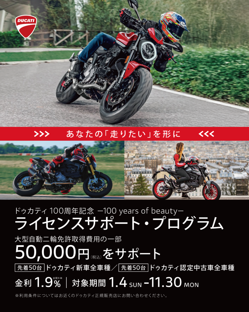 2025年1月1日以降に新規で大型自動二輪免許(MT)を取得され、2026年11月30日までに、ドゥカティ又はスクランブラーの新車をご成約・ご登録いただいた方、先着100名様に免許取得費用のその一部として5万円(税込)サポートいたします。